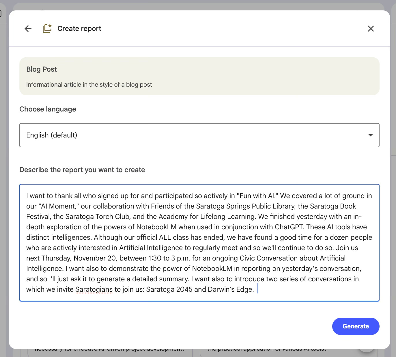 We talked for 90 minutes. Otter captured it all and we gave the transcript to NotebookLM. You’ll see below the prompt I gave it, representing the essence of what I wanted to communicate. In its report, NotebookLM simply elaborates.